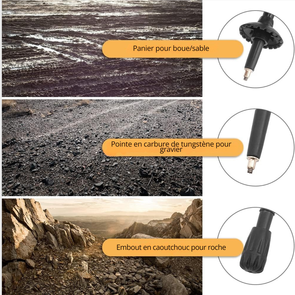 La fibre de carbone est appréciée pour son excellent rapport rigidité/poids. Elle permet d’obtenir des bâtons très légers tout en restant performants pour un usage outdoor.