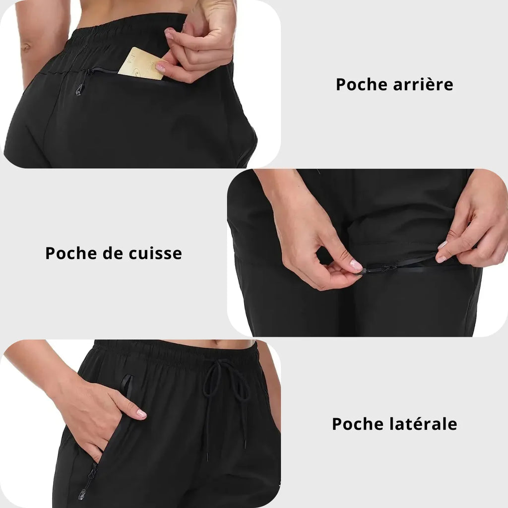 2 poches latérales zippées, 1 poche cargo zippée et 1 poche arrière zippée pour garder vos essentiels en sécurité.