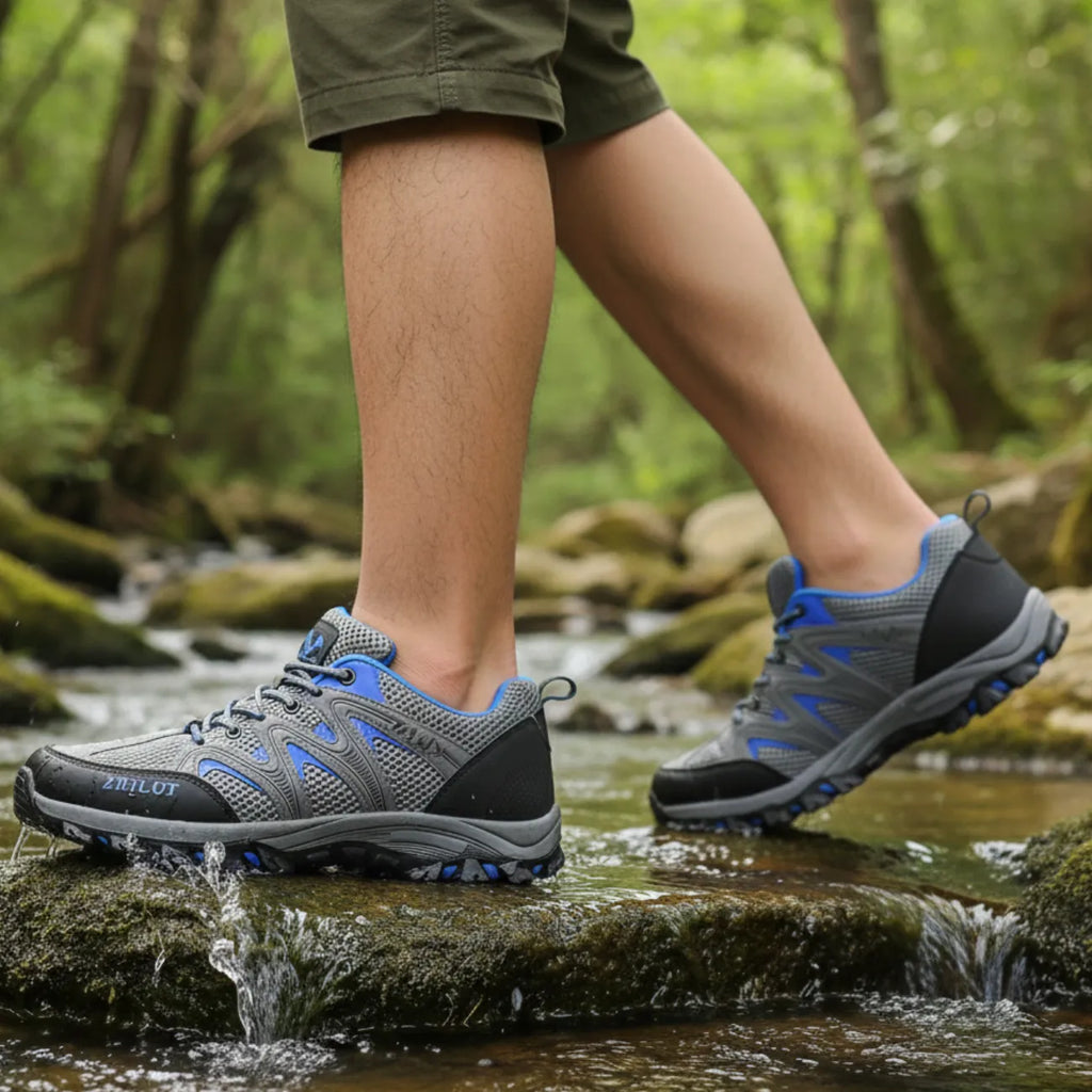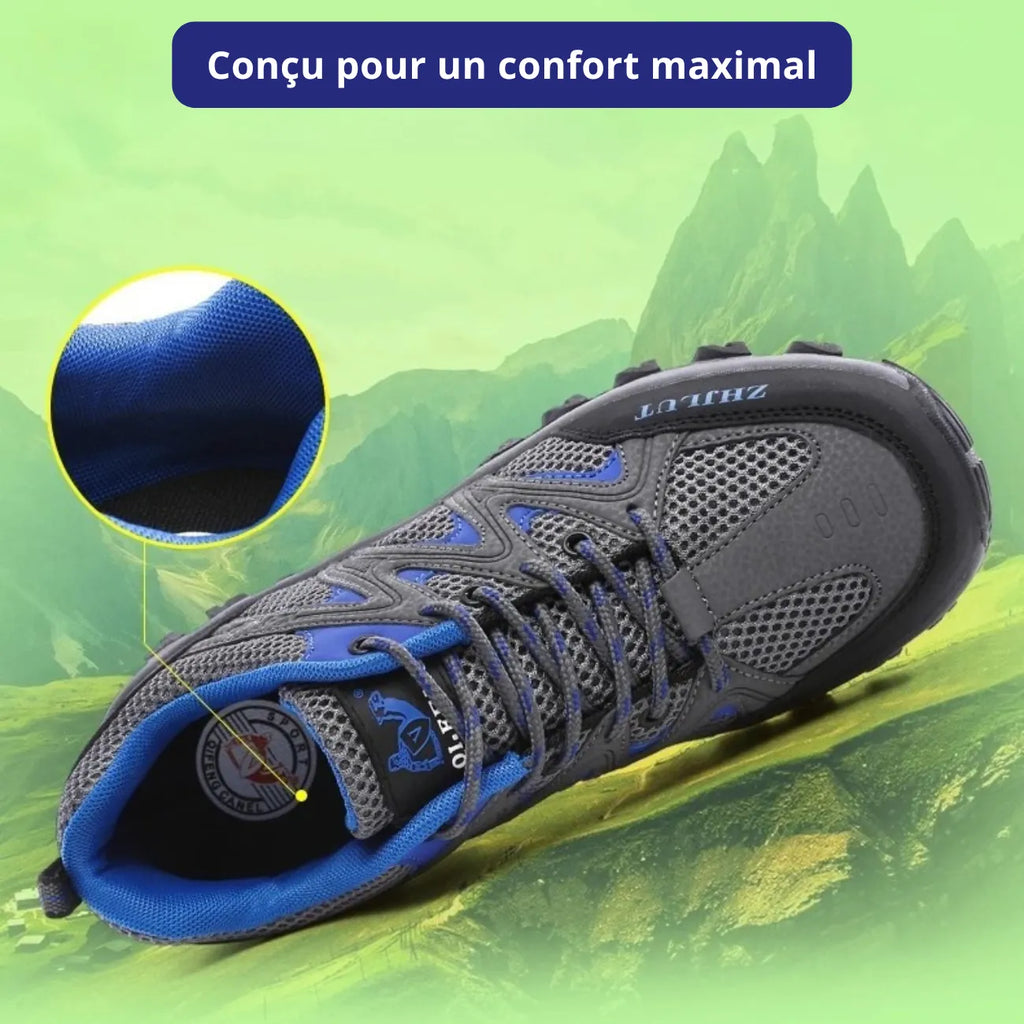 Pare-pierres pour la protection, tige mesh respirant et renforts techniques pour la durabilité.