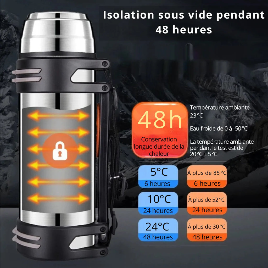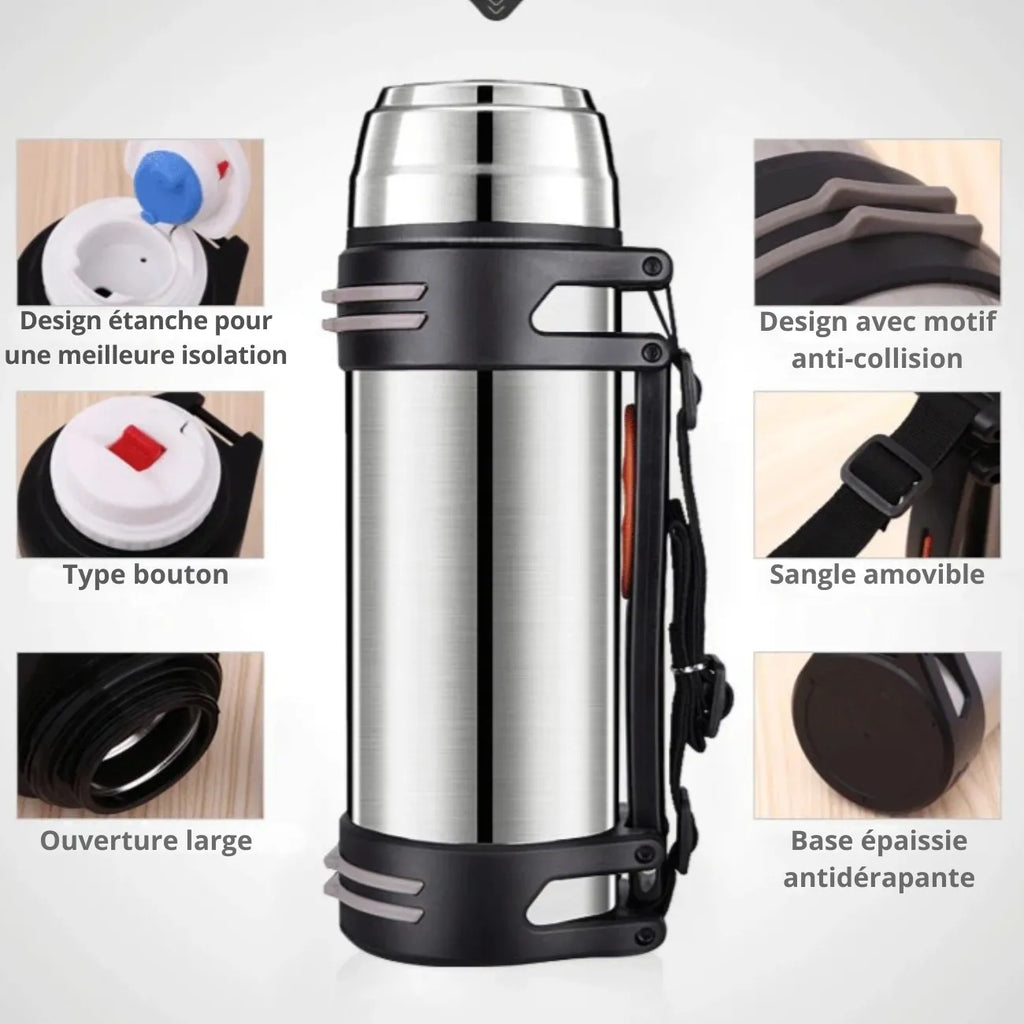 Idéale pour la randonnée, le trekking, le sport et les voyages, cette gourde isotherme grande capacité allie résistance, polyvalence et confort. Fabriquée en acier inoxydable et plastique robuste, elle permet de transporter facilement vos boissons chaudes ou froides, même lors des sorties les plus longues.