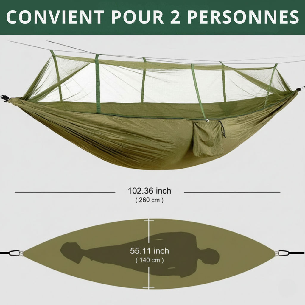 Hamac-tente spacieux pour une ou deux personnes, idéal pour la détente en extérieur.