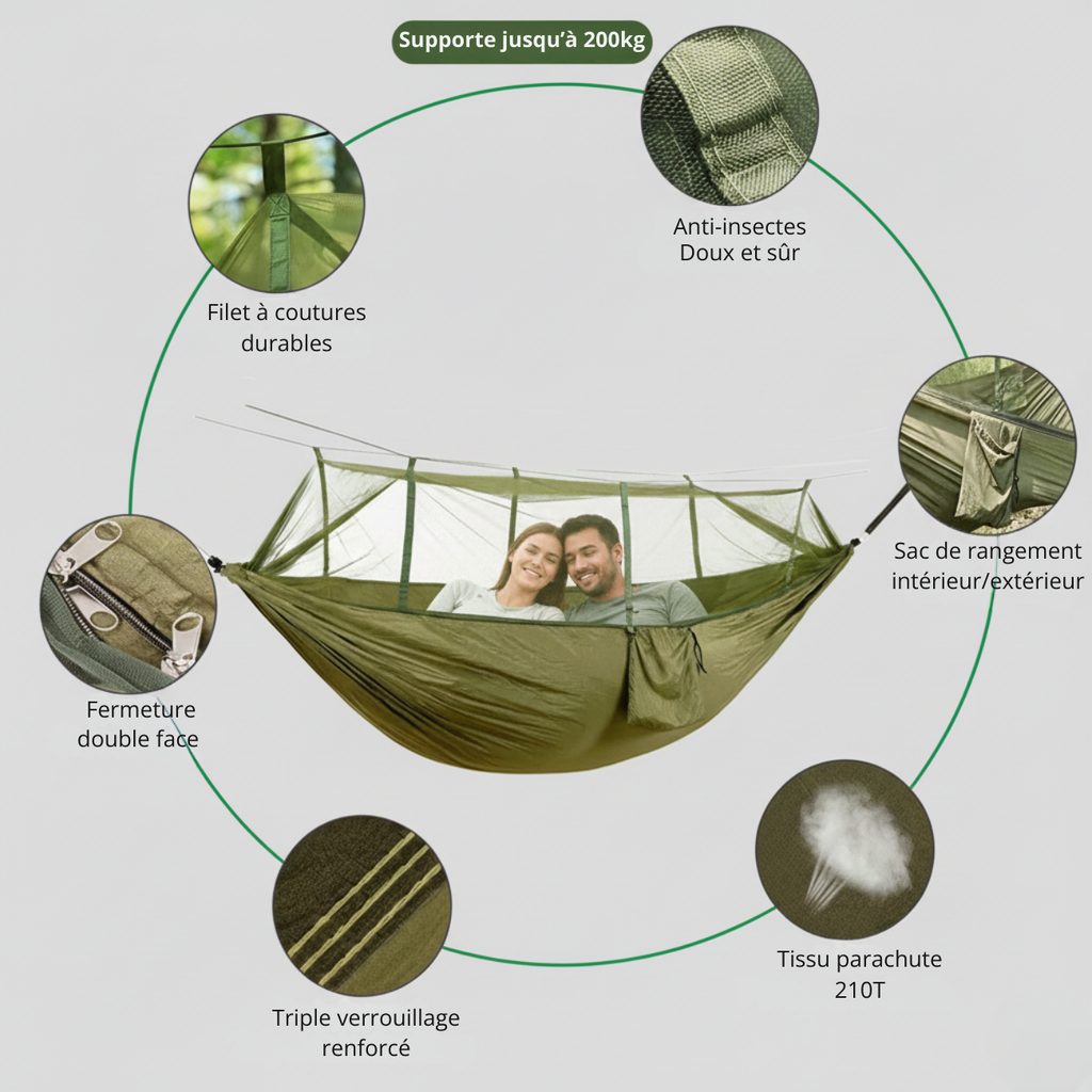 Ce hamac avec moustiquaire est léger et facile à transporter, pour profiter de moments de détente partout en plein air, prêt à l’usage en quelques secondes.
