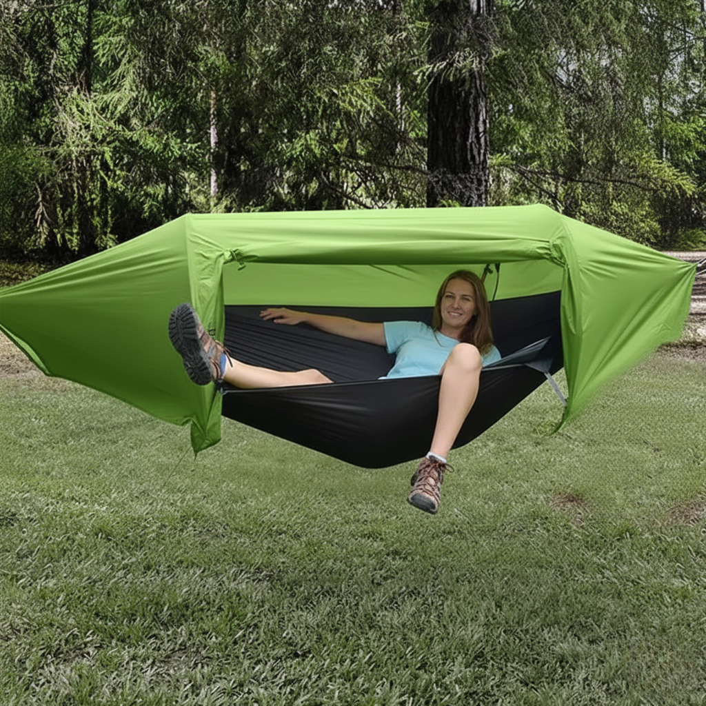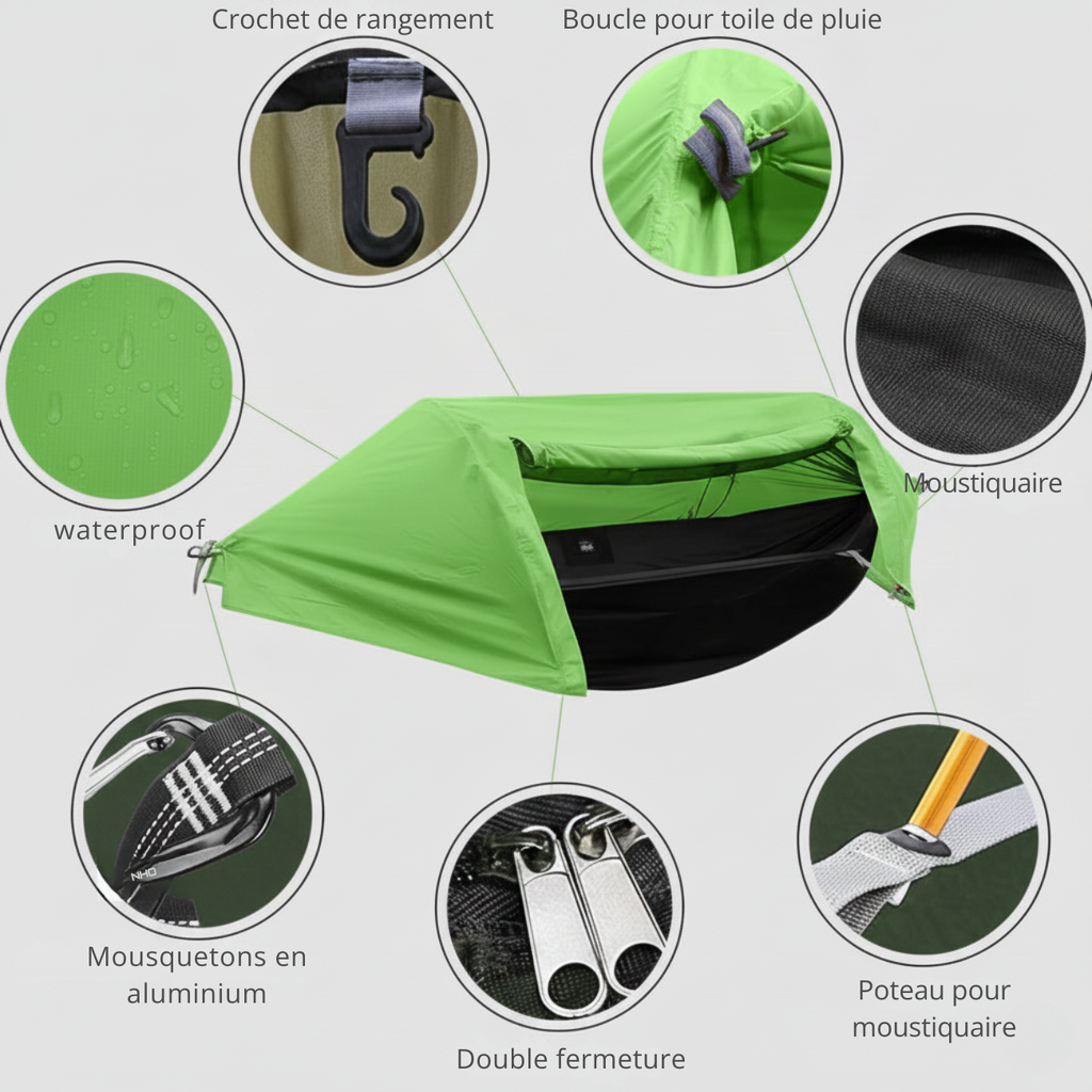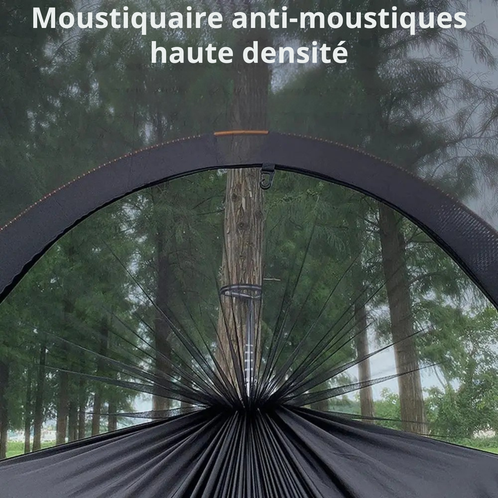 Hamac-tente spacieux pour une ou deux personnes, idéal pour la détente en extérieur.