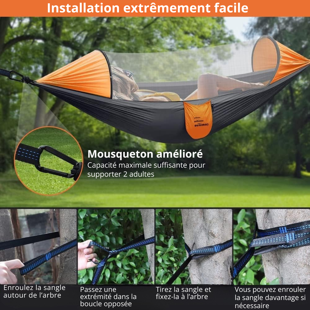 Se suspend en quelques secondes entre deux arbres, sans effort.