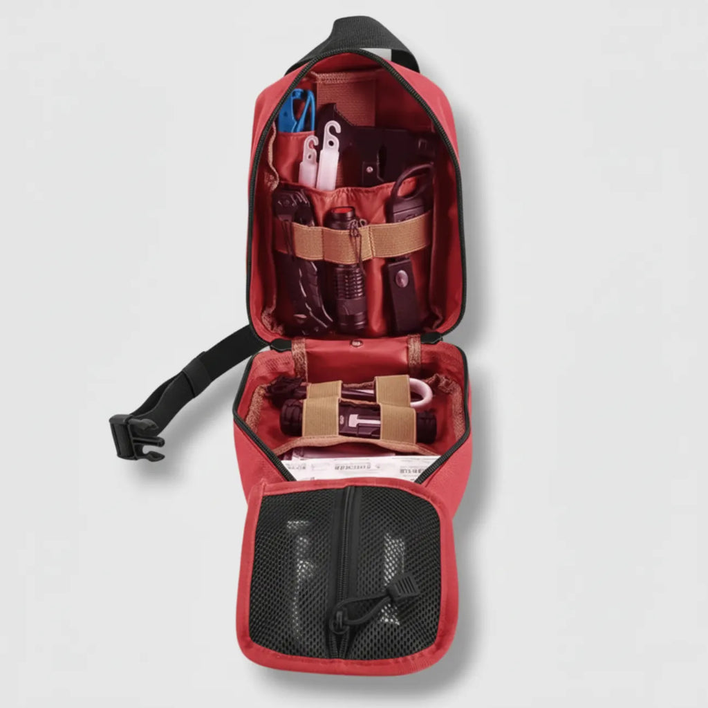 Le kit regroupe plusieurs accessoires essentiels (ex. accessoires de premiers secours basiques, outils pratiques, éléments de signalisation…) pour vous aider à gérer les situations imprévues en extérieur. Le contenu exact peut varier selon les séries, référez-vous à la fiche produit détaillée.