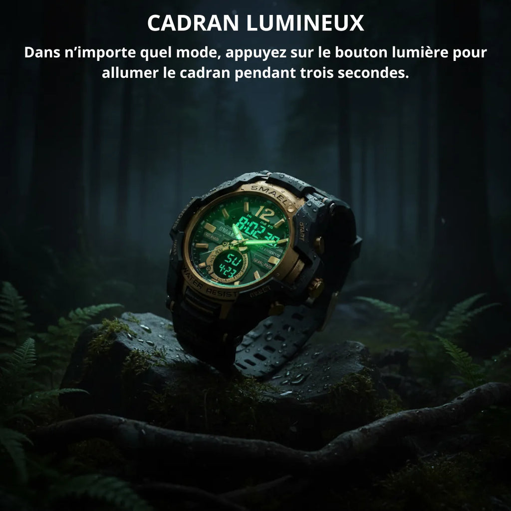 Équipée d’un écran LED lumineux avec rétroéclairage, cette montre garantit une lecture facile de jour comme de nuit.