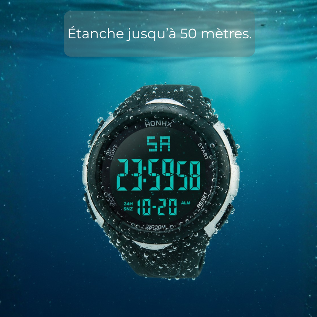 Conçue pour le plein air, elle est étanche jusqu’à 50 m : idéale sous la pluie, à la douche et pour la natation (ne pas appuyer sur les boutons sous l’eau).