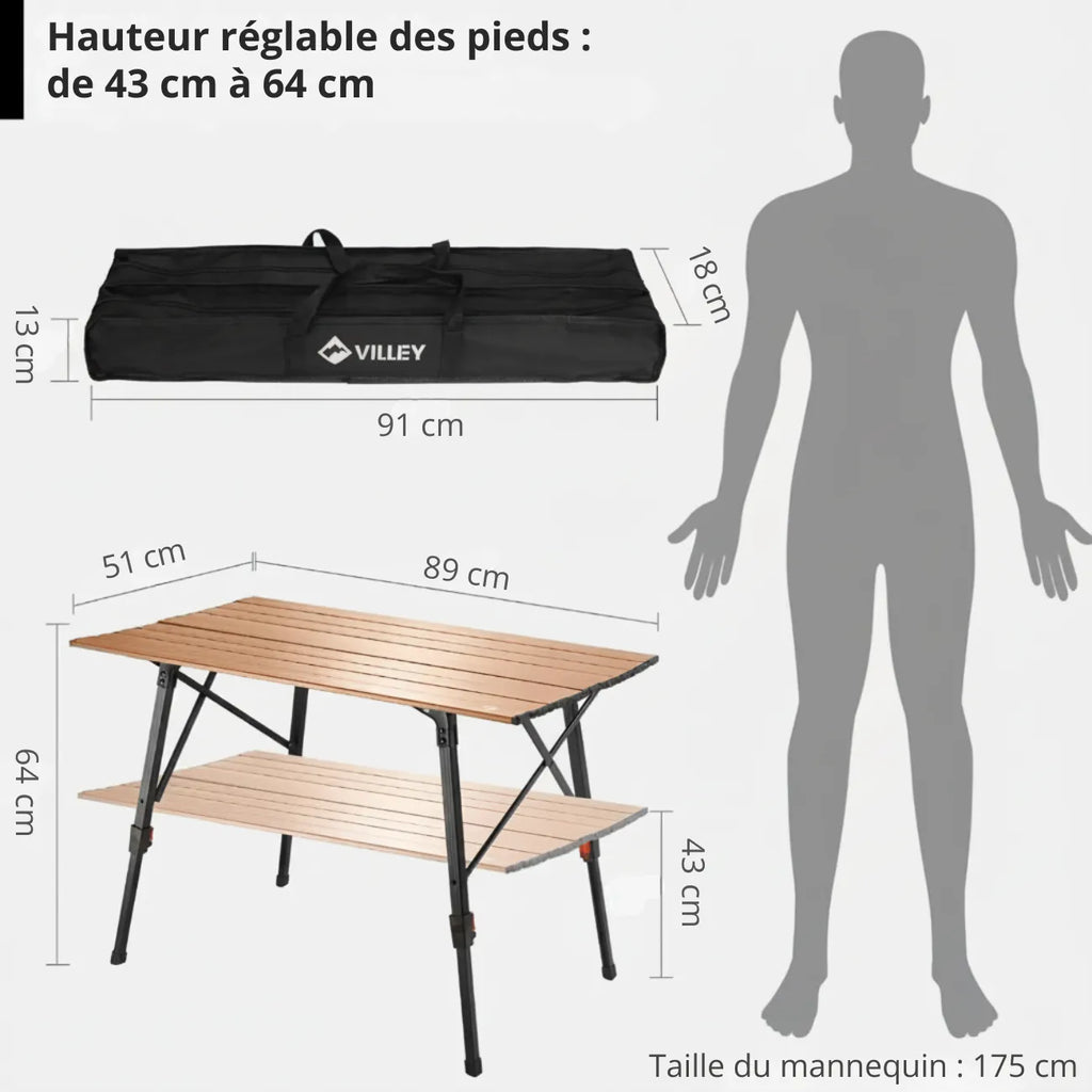 Légère, stable et facile à transporter, notre table pliante de camping en aluminium vous accompagne dans toutes vos aventures en plein air. Sa hauteur réglable s’adapte à vos besoins, tandis que son plateau spacieux offre une surface pratique pour cuisiner, manger ou poser votre équipement.
