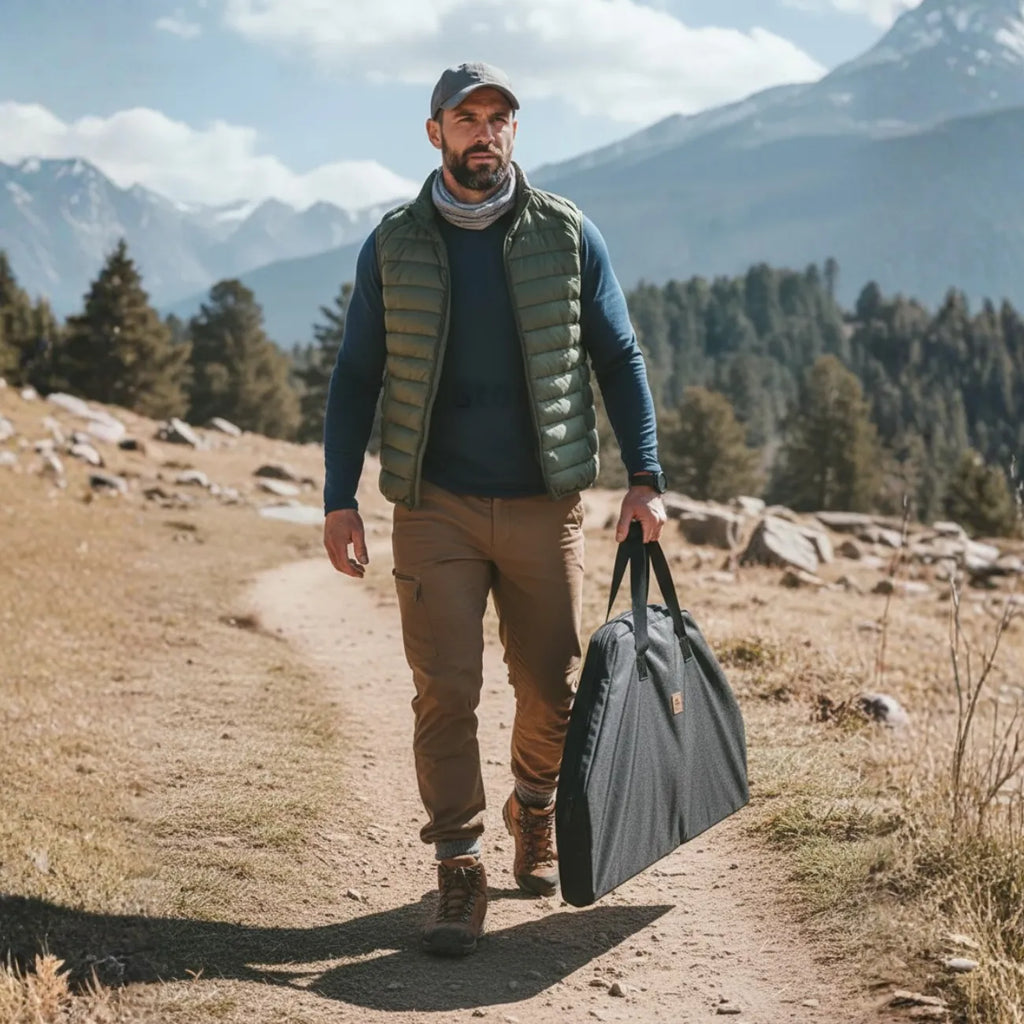 Une fois pliée, elle devient très compacte et se glisse aisément dans son sac oxford 900D, sans encombrer votre coffre ou votre matériel.