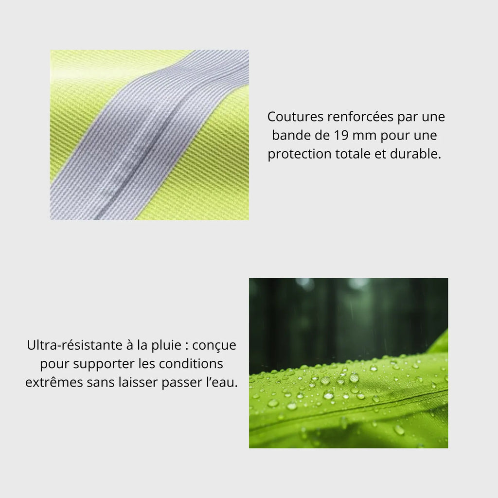 L’ourlet élastique limite les infiltrations de vent et de pluie, tandis que les bandes réfléchissantes améliorent votre visibilité.
